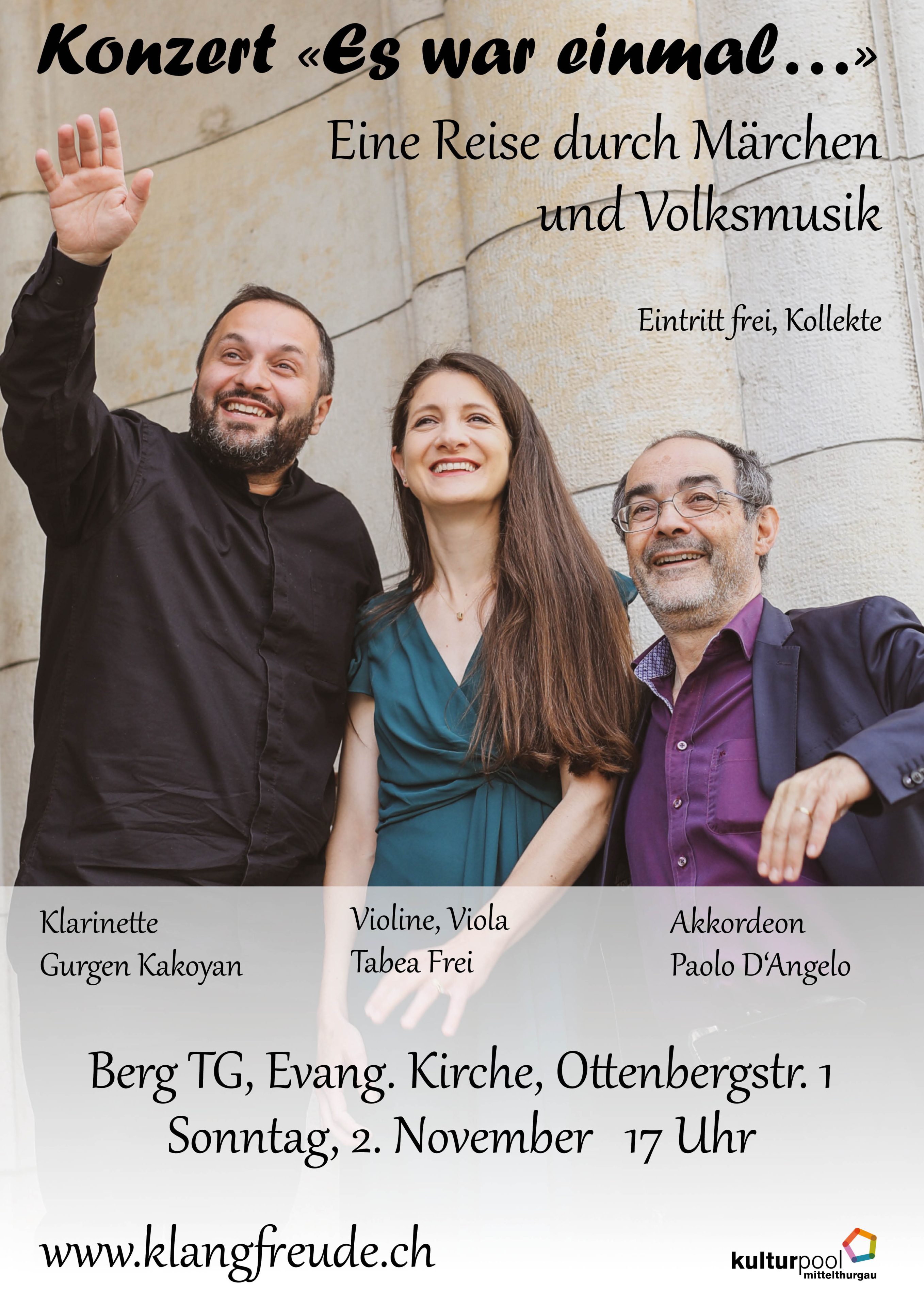 Die Welt unterliegt einem Zauber – was nicht bedeutet, dass alle Wünsche in Erfüllung gehen. Aus Schweden zum Beispiel stammt das Lied „Herr Mannelig“. Darin wird ein Mann von einer Waldjungfrau um seine Hand gebeten. Sie verspricht ihm viele Geschenke – doch er lehnt ab, weil sie eine Heidin ist. Positiv gestimmt ist dagegen das armenische Lied „Qele qele“, das zum Tanz und zur Lebensfreude animiert. Die Geigerin Tabea Frei und der Akkordeonist und Organist Paolo D’Angelo treten regelmässig zusammen auf, zuletzt waren sie auf Tour mit dem Panflötisten Urban Frey. Für das Programm „Es war einmal … Eine Reise durch Märchen und Volksmusik“ haben sie sich nun mit dem Klarinettisten und Instrumentenbauer Gurgen Kakoyan zusammen getan.