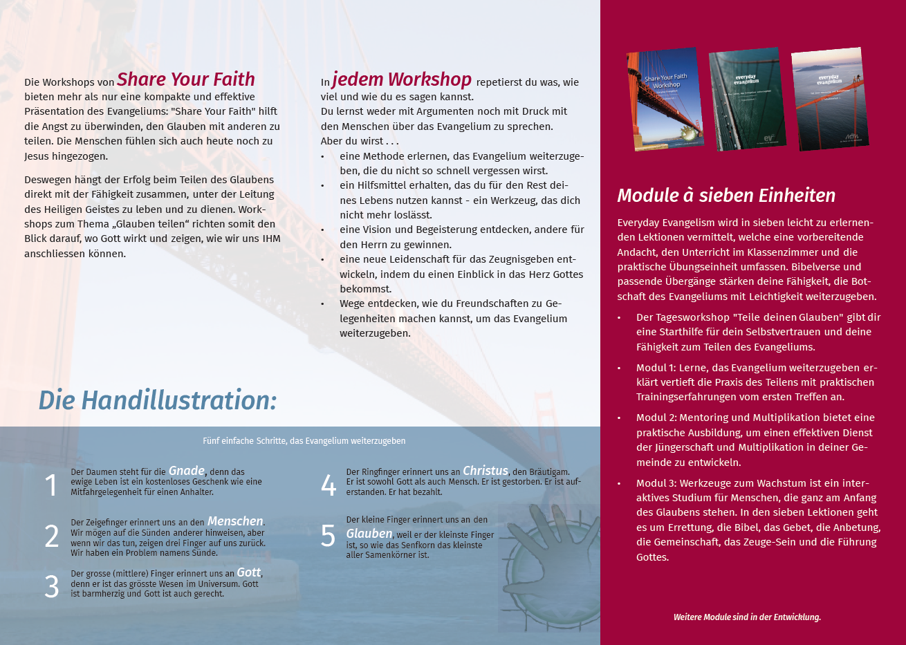 Einer der Hauptgründe, weshalb Christen Mühe haben, das Evangelium weiterzugeben, ist, dass sie kein praktisches und effektives Werkzeug dazu haben. EE gibt dir das umfassendste Werkzeug in die Hand, um deinen Glauben zu teilen. Was du in diesem Kurs lernst, ist einfach und du wirst es nicht so schnell wieder vergessen, weil du dieses Werkzeug immer bei dir hast - die fünf Finger!