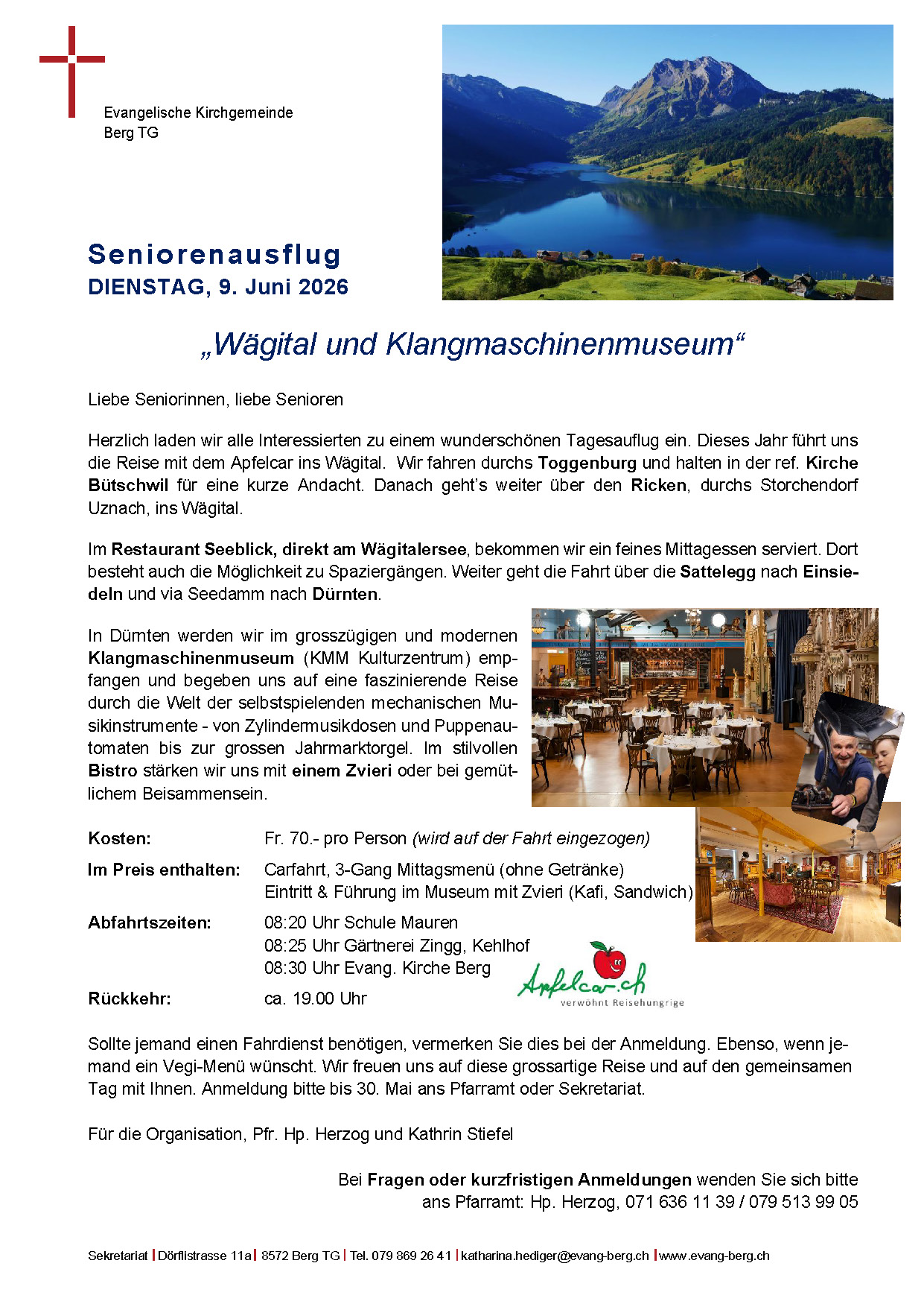 Herzlich laden wir alle Interessierten zu einem wunderschönen Tagesauflug ein. Dieses Jahr führt uns die Reise mit dem Apfelcar ins Wägital. Wir fahren durchs Toggenburg und halten in der ref. Kirche Bütschwil für eine kurze Andacht. Danach geht’s weiter über den Ricken, durchs Storchendorf Uznach, ins Wägital.
